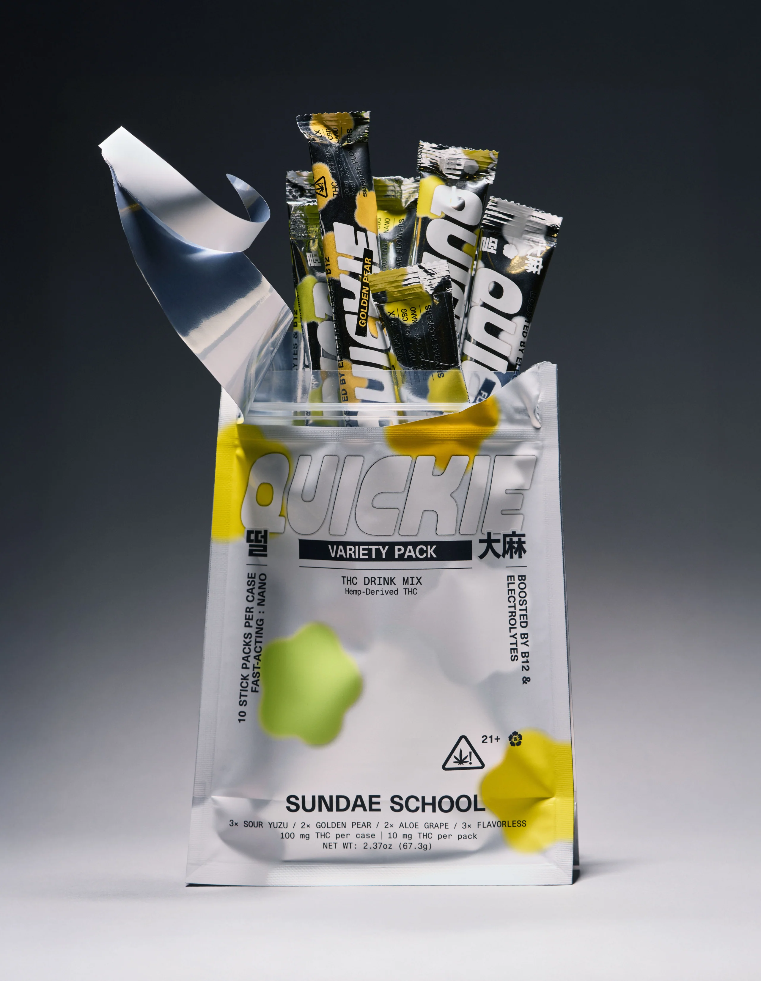 Quickie is a fast-acting powdered THC drink mix designed to help you take a break 🏝️. Transform any beverage into an infused drink - a convenient way to get high in as little as 10 minutes 🏎️ . Our proprietary blend of electrolytes and Vitamin B12 will ensure a smooth experience with no grassy aftertaste or cotton mouth 💦. Enjoy a Quickie anywhere, anytime 💃🦩